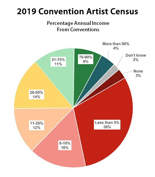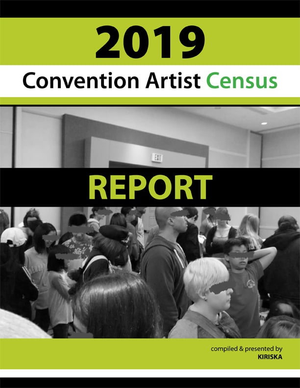 366 convention artists in 14 disciplines provided data for an informal 2019 census. The results are wrapped up neatly in this 55-page report. In total, there are 96 colorful graphs and charts and over 50 tables of data, featuring valuable demographic information and financial data like percentage annual income from cons and total annual income from conventions, allowing for a big-picture look at convention artists never before available! I wrangled spreadsheets so you don't have to.