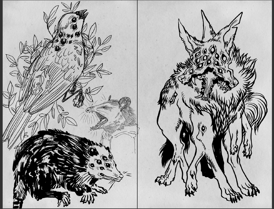 A collection of eye and body horror sketches and drawings from fall 2016 to spring 2017. Features 40 pages of monsters, creatures, and animals with too many or too few eyes, teeth, and limbs.